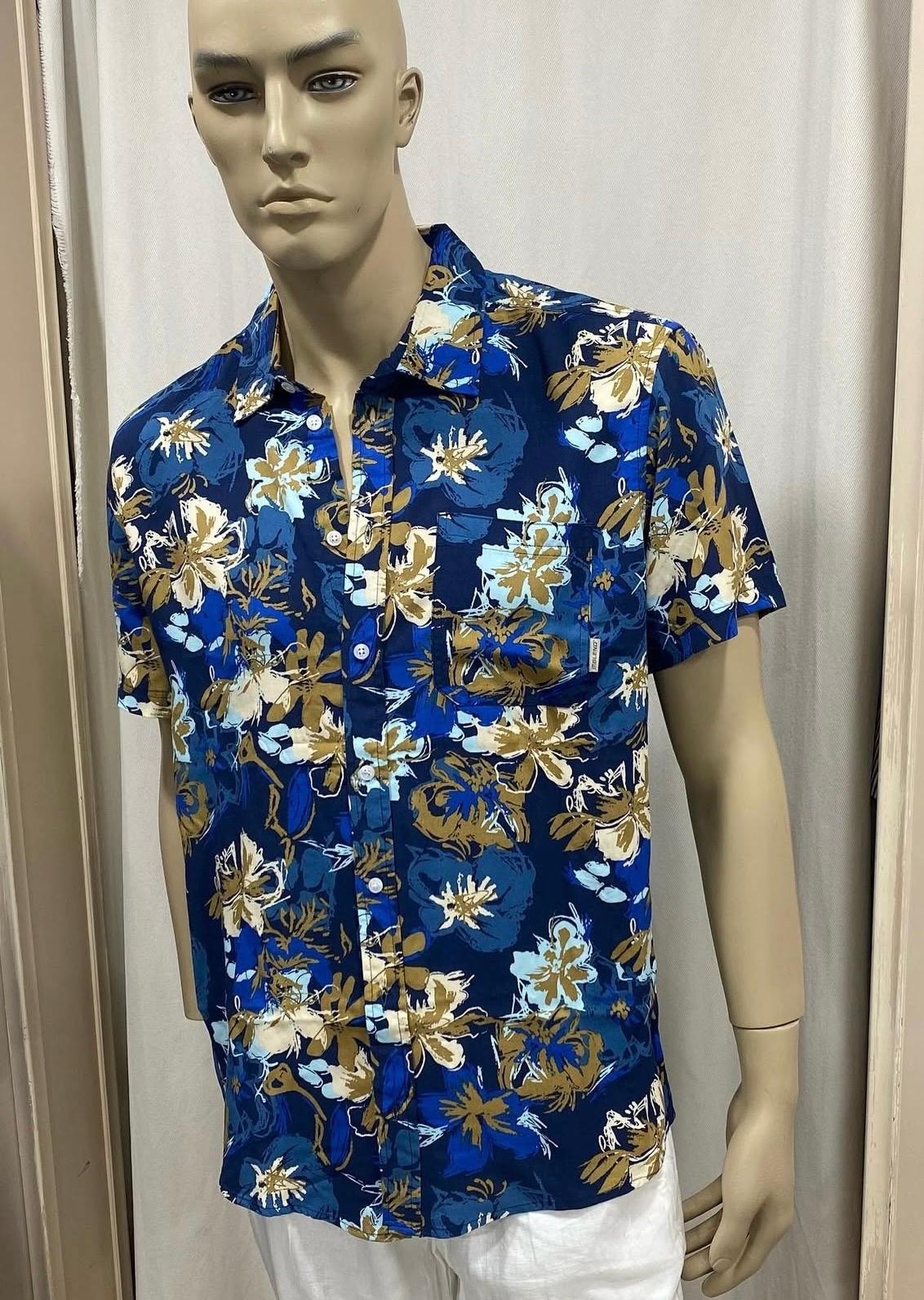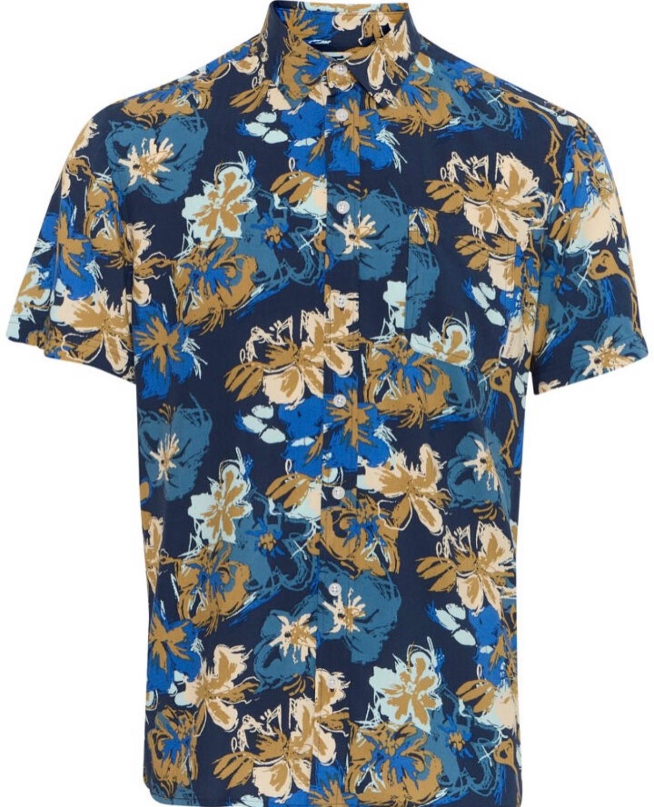 Camicia da uomo a maniche corte a fantasia floreale con fondo blu, ideale per un look estivo casual e moderno. Tessuto leggero e traspirante in viscosa, per il massimo comfort.