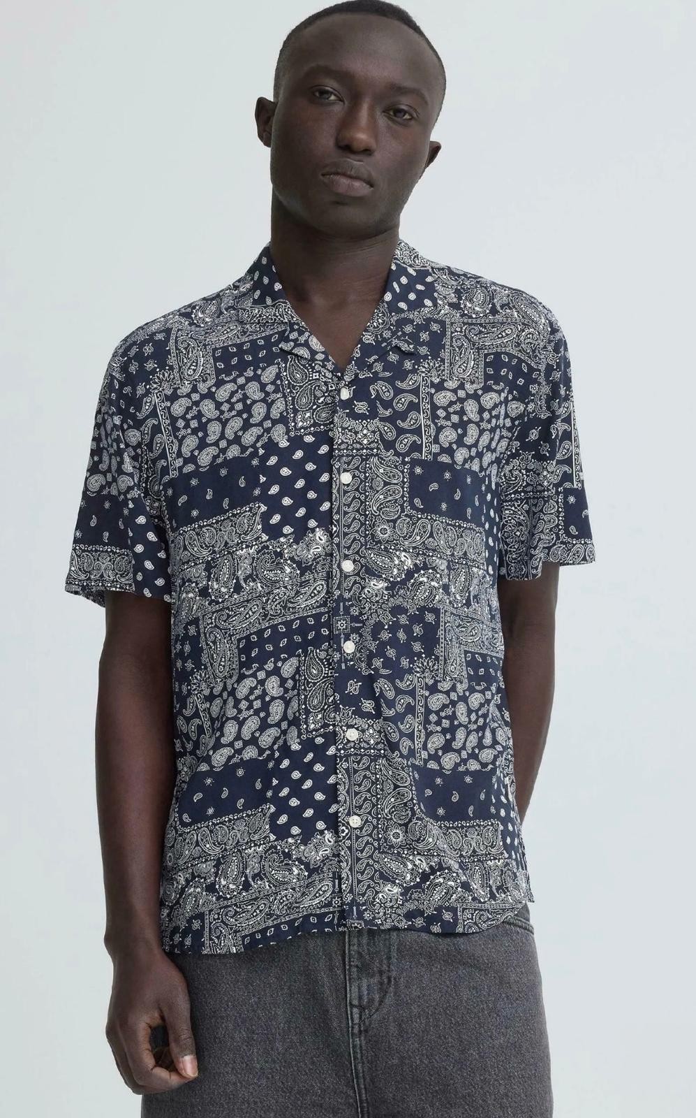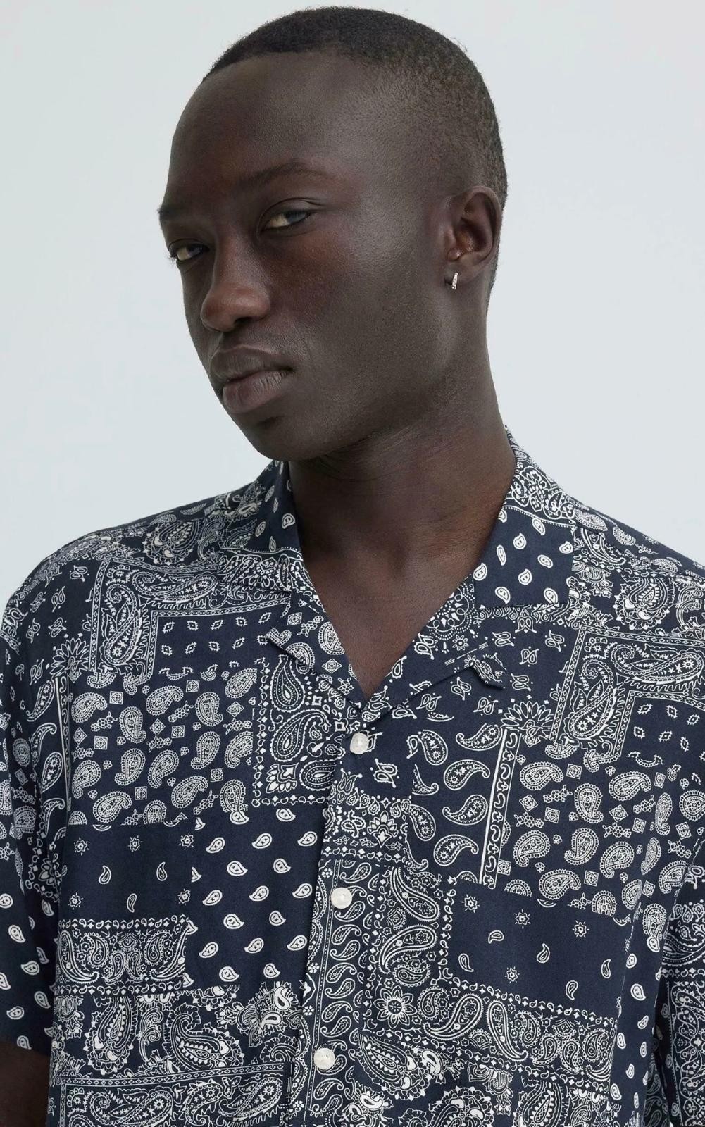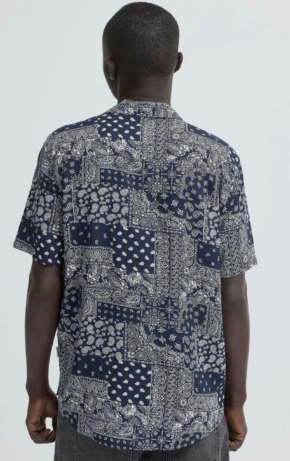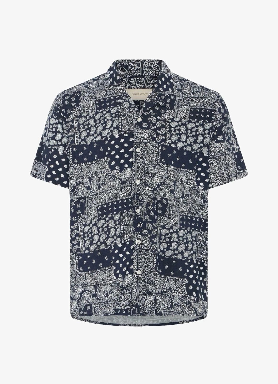 Camicia da uomo a maniche corte, fondo blu con disegni bianchi, ideale per un look estivo casual e moderno. Tessuto leggero e traspirante in viscosa, per il massimo comfort.